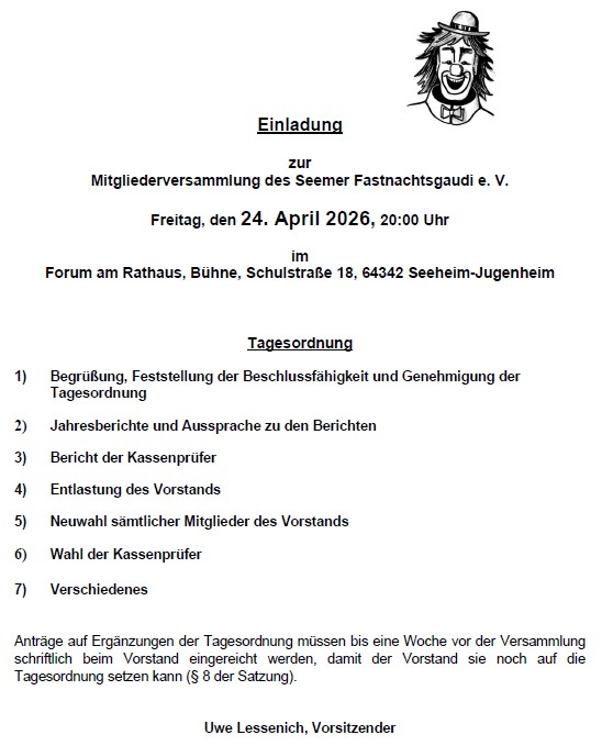 Der Kartenvorverkauf beginnt am 11.11. 09:00 Uhr. Weitere Informationen findet ihr auf unserer Veranstaltungsseite zur Fastnacht 2026: https://seemer-fastnachtsgaudi.de/Fastnacht2026